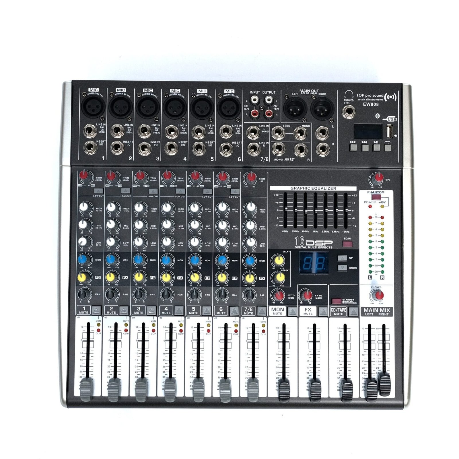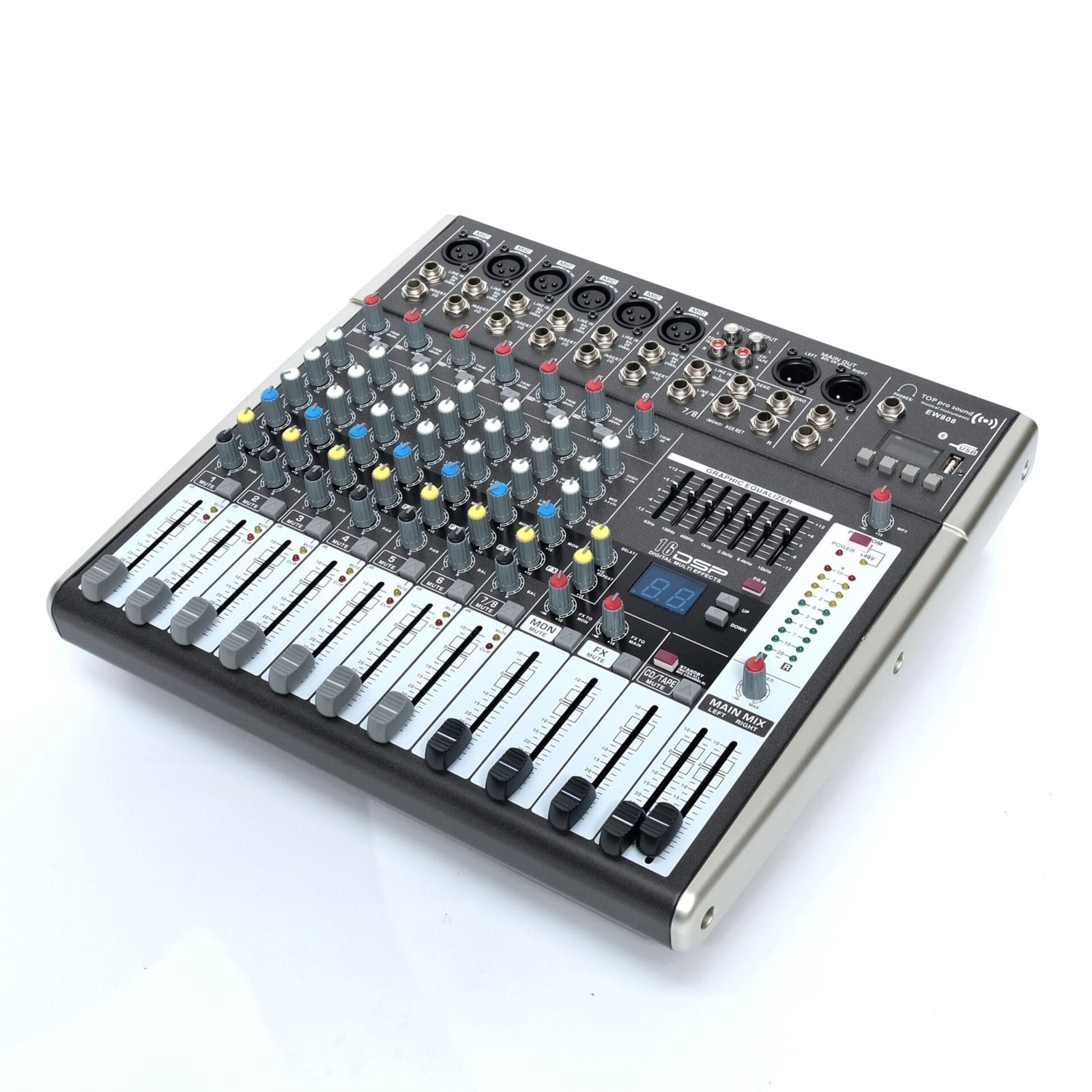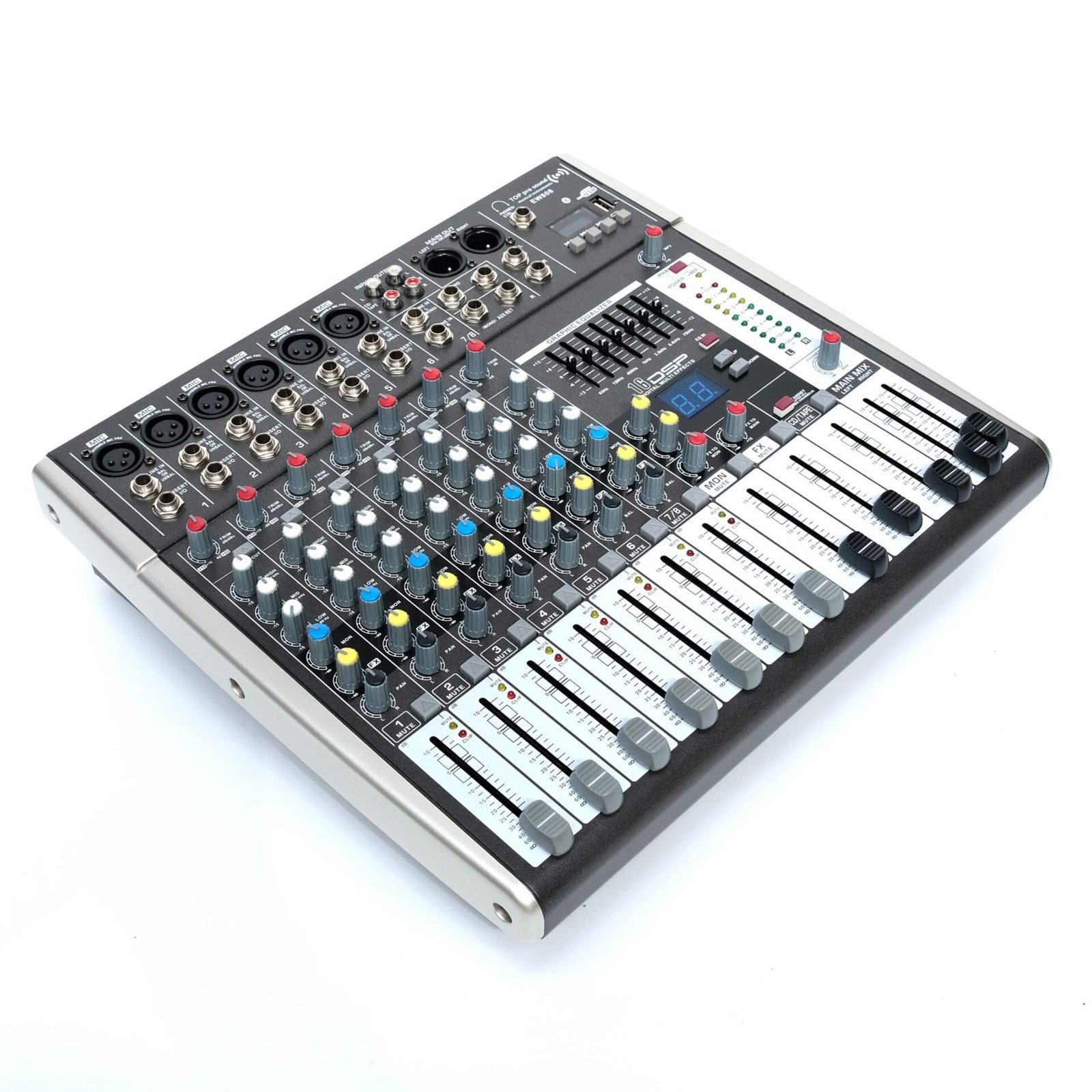 The TOP PRO EW808 DSP Echo Mixer is a compact yet powerful 8-channel audio mixing console designed for venues and setups that need reliable sound mixing with built-in digital effects. Featuring dedicated DSP echo processing, this mixer is ideal for live sound, small stage performances, houses of worship, conferences, and karaoke systems.