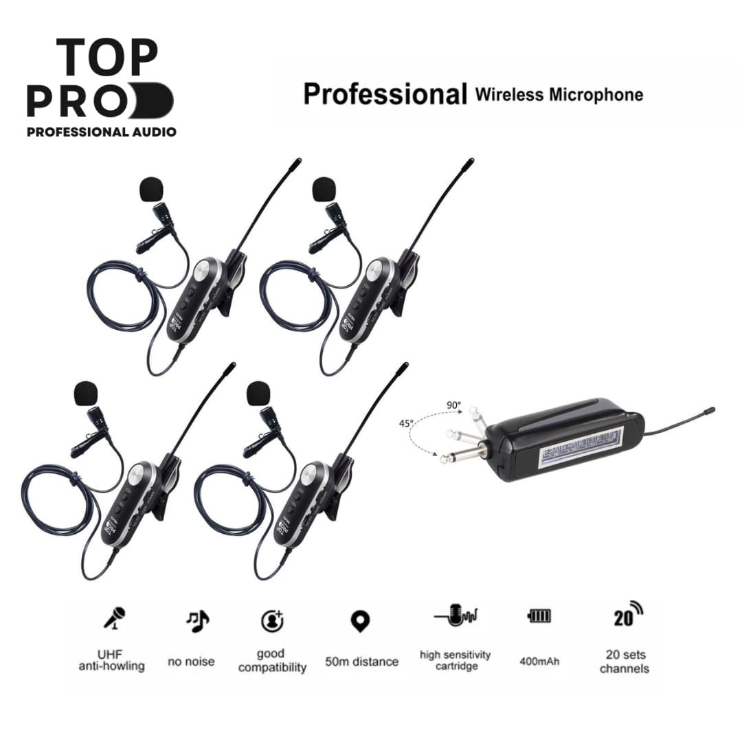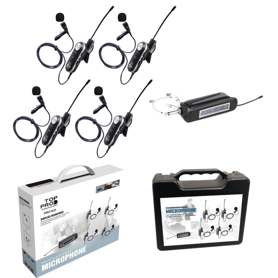 The TOP PRO PRO-4CII Wireless 4 Lapel Microphone is a professional-grade system that delivers crystal-clear, hands-free audio for conferences, panel discussions, church services, theater performances, and live events. This system includes four wireless lapel (clip-on) microphones paired with a reliable multi-channel receiver, allowing multiple speakers or performers to move freely on stage or around the room without tangled cables or dropouts.