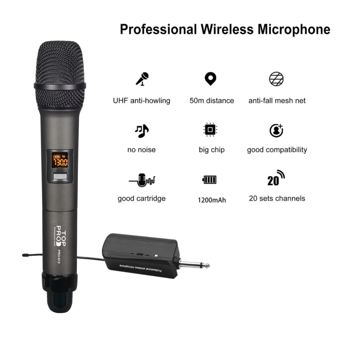 The TOP PRO PRO-612 Wireless Hand Microphone offers professional-grade wireless audio for singers, speakers, and presenters. Designed with high-quality components and advanced wireless technology, this microphone provides clear sound with minimal interference, allowing freedom of movement on stage or during events.