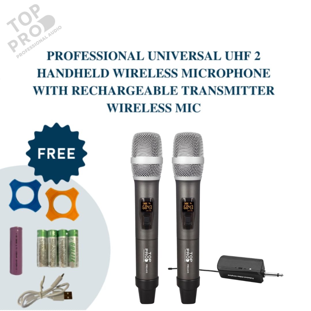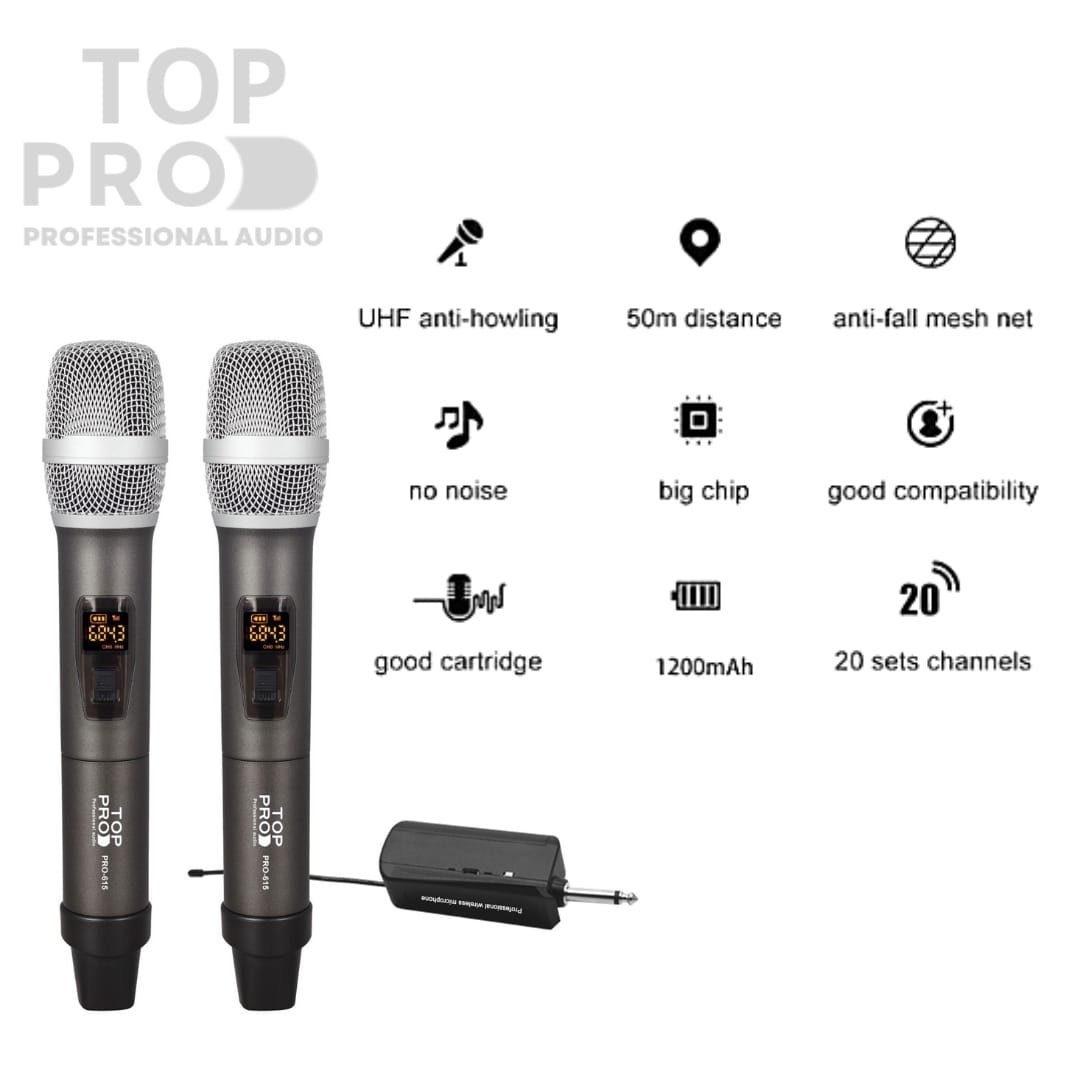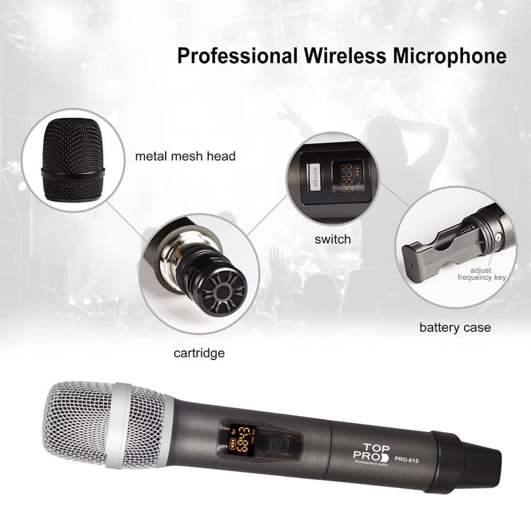 TOP PRO PRO-615 DUAL WIRELESS MICROPHONE has an amazing layered sound output and provides a more powerful, clearer signal and better sound quality, lowering the chance of interference and dropouts. It provides maximum gain before feedback and makes your voice cut through any mix. This Microphone focuses on the invention of design and technology to provide a better microphone-using experience to customers worldwide.