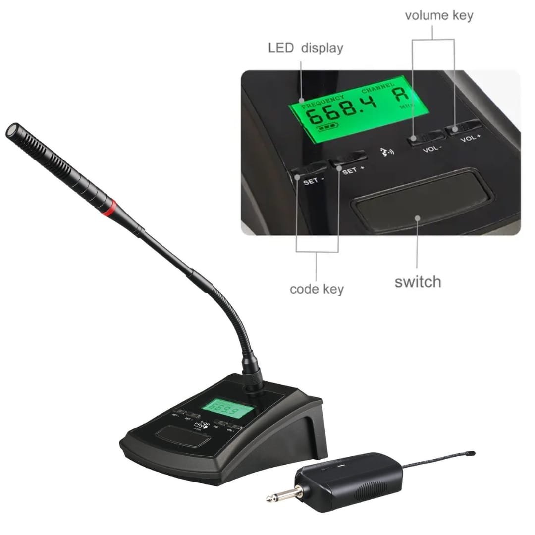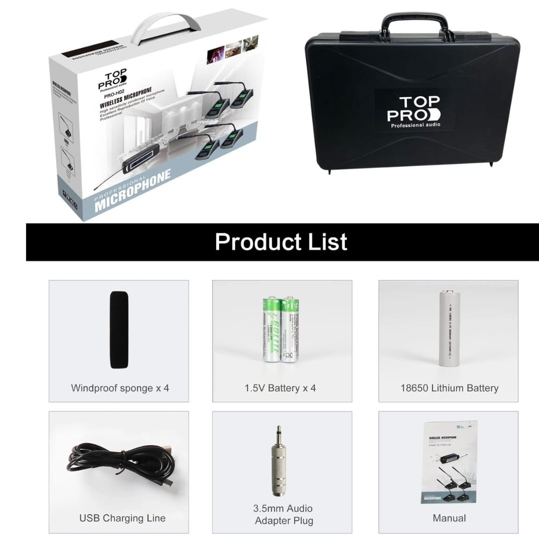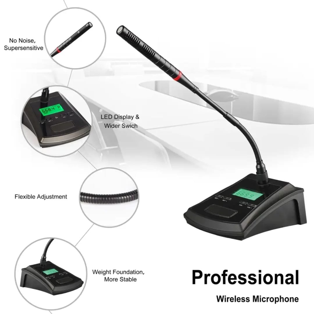 Featuring dynamic microphones and high-quality components, the TOP PRO PRO-H02 4 CH CONFERENCE MICROPHONE ensures crisp, distortion-free audio. The system includes a dedicated receiver for seamless integration with your existing setup. The professional design allows it to blend seamlessly into any conference room, while the adjustable mic sensitivity ensures that everyone in the room can be heard clearly.