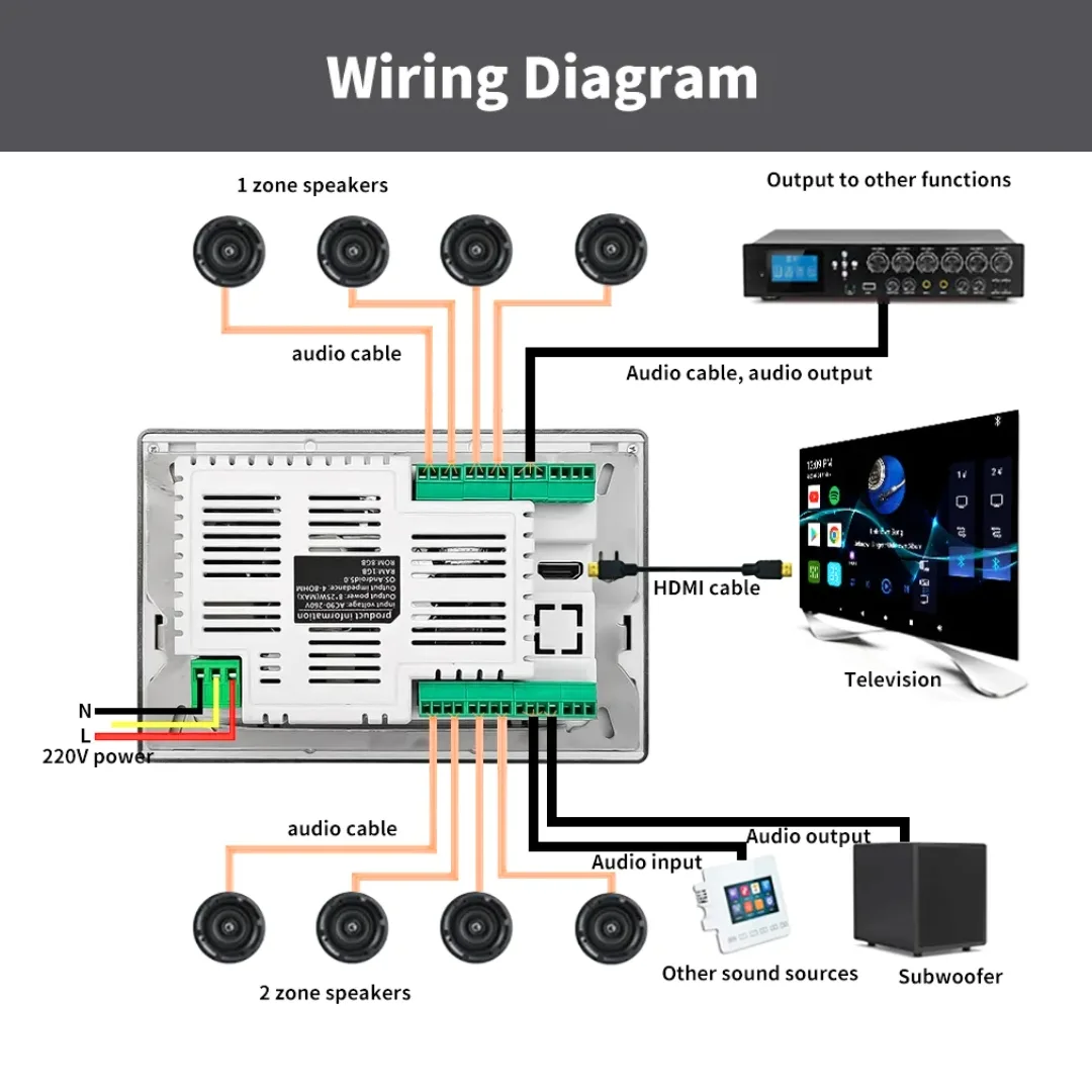 With built-in Wi-Fi, Bluetooth, and app support, you can access streaming platforms, play music via mobile devices, or integrate it into a smart home audio system. The onboard Touch Screen Android Audio Wall Amplifier delivers clean sound output, making it a perfect fit for ceiling or wall-mounted speakers across any room.