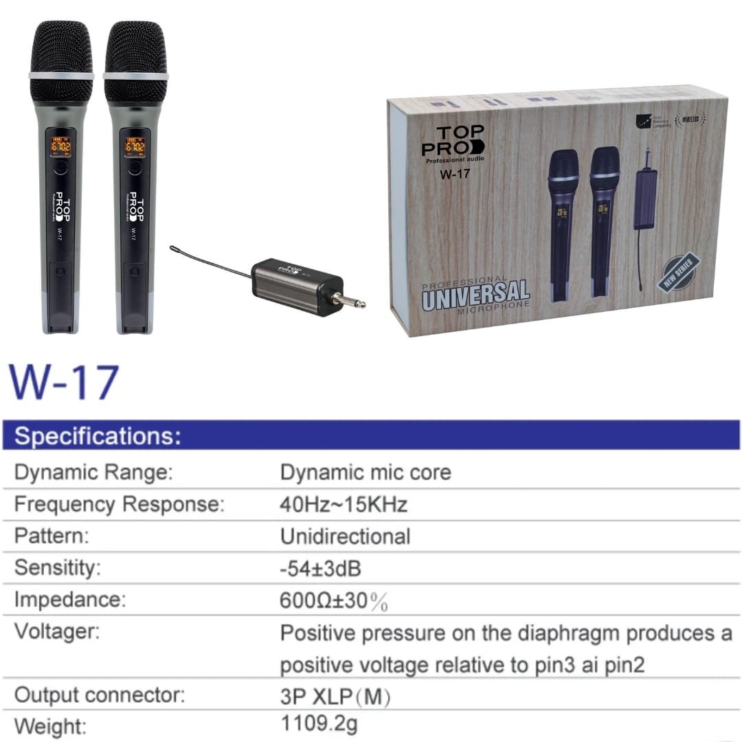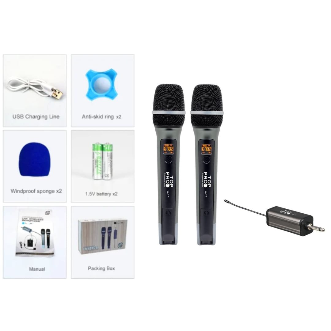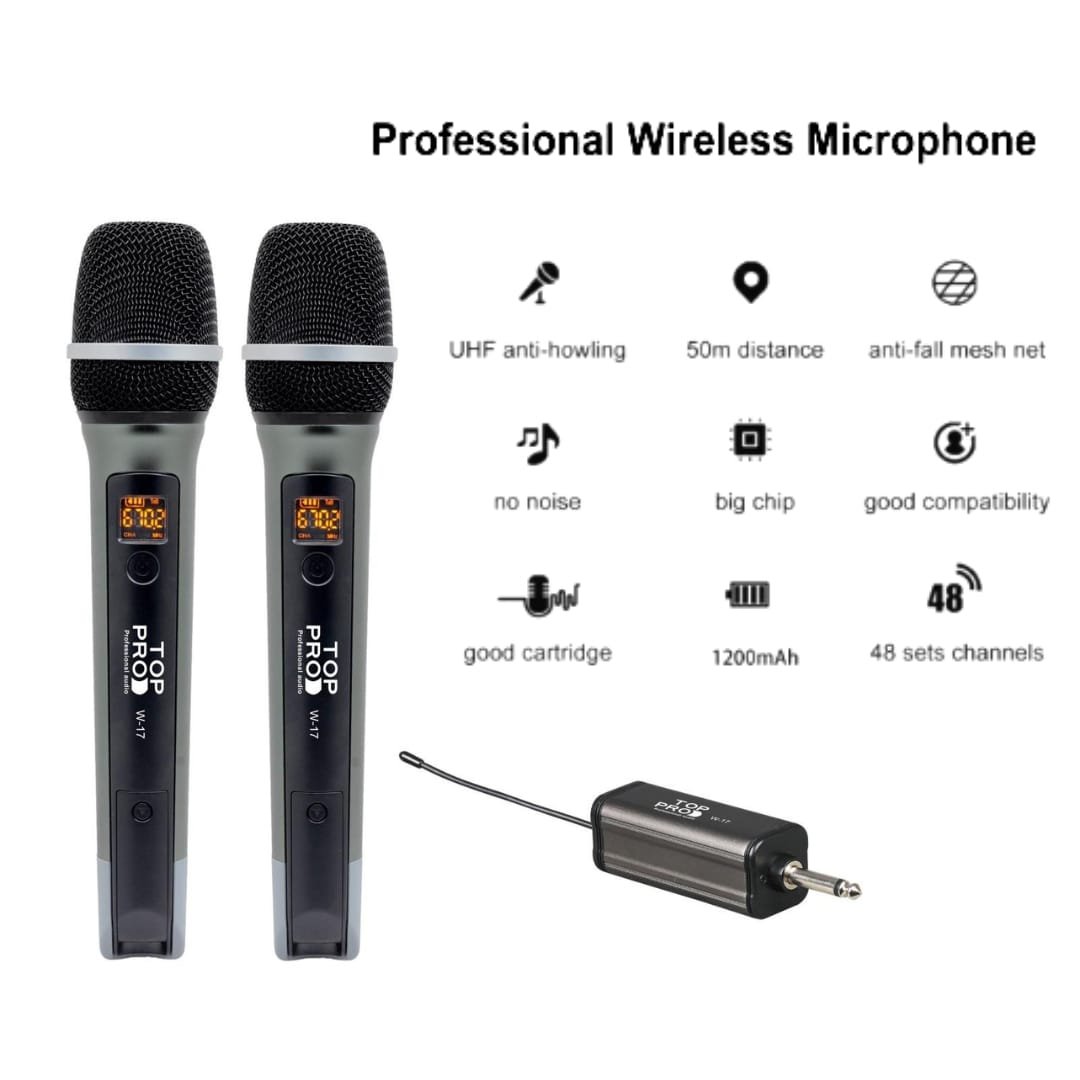 TOP PRO W-17 DUAL WIRELESS HAND MICROPHONE Professional UHF Karaoke Microphone Wireless Headset All Metal Dual Cordless Handheld Dynamic Mics for Mixing, Speech, Church, and Wedding Karaoke.