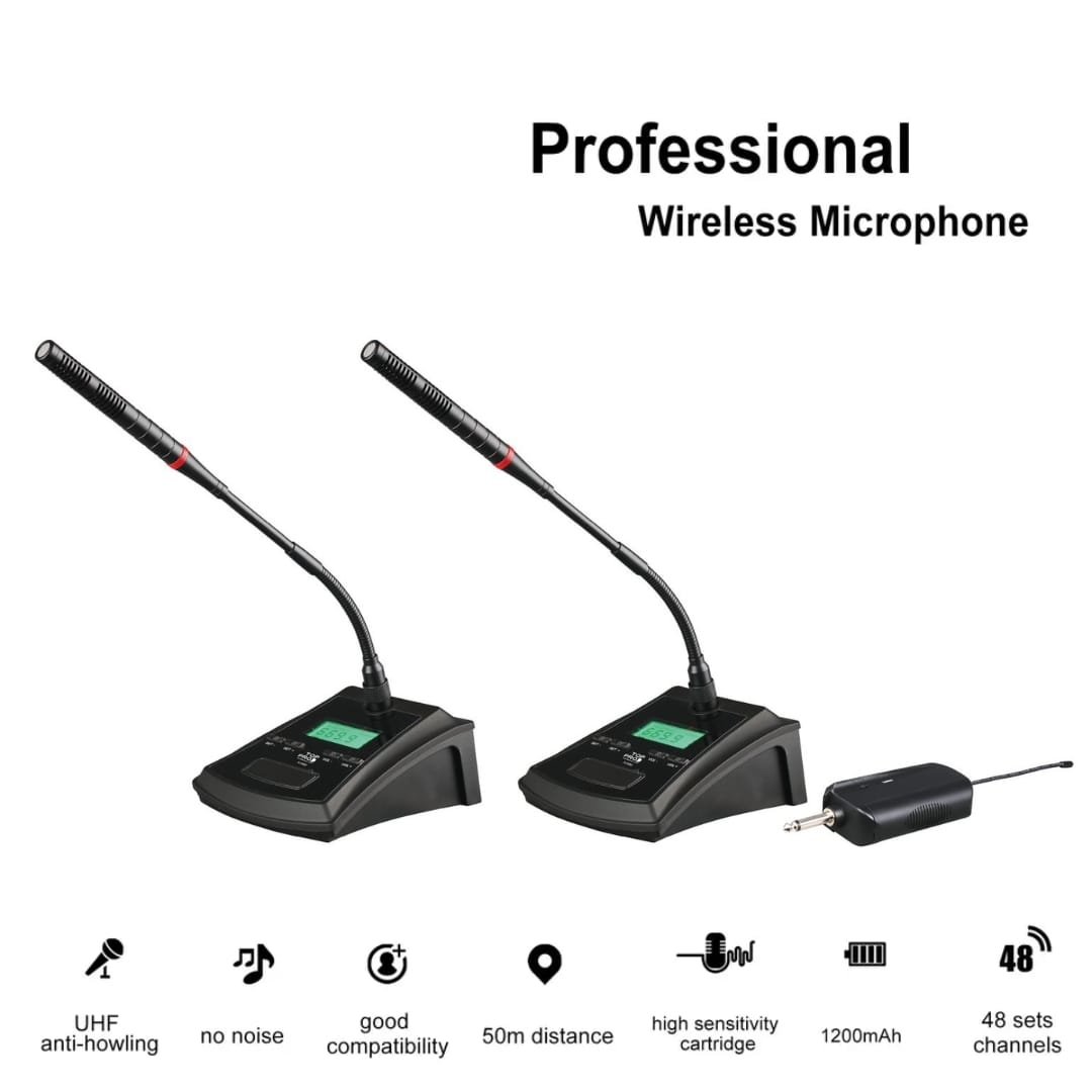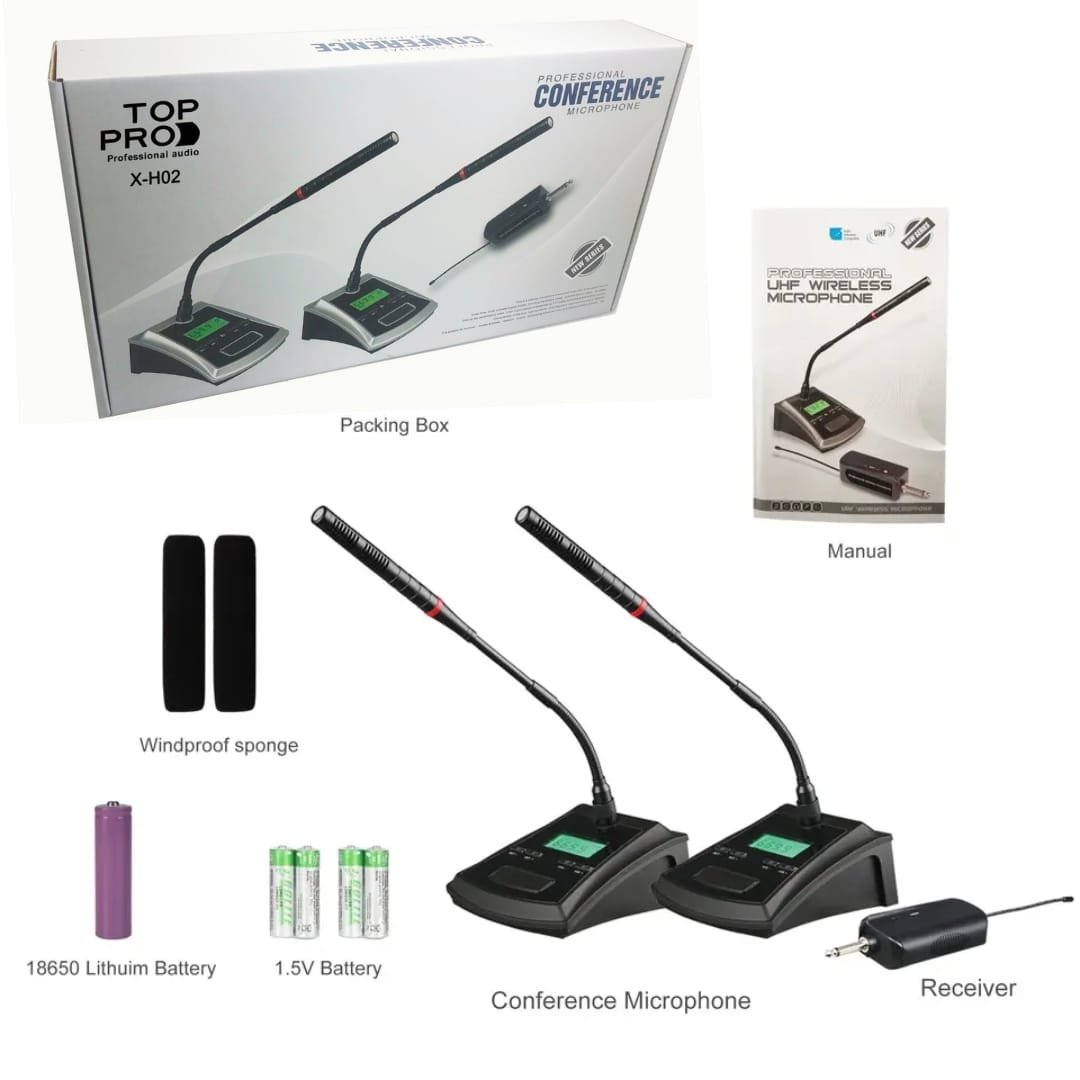 TOP PRO X-H02 WIRELESS CONFERENCE MICROPHONE With Rechargeable Battery. It can change the volume and has a hint of band music. There are three different ways to power it: battery power, external illusion power, and DC power. Choose the important performance indicator. It makes good logic to broadcast locking instructions and PTT safety messages. High sensitivity, a broad frequency response, and an extended pickup range are all features of Aura. It can be used in terminals, ticket booths, stations, and airports, to announce cutting-edge news and make products speak, as well as in Karaoke, voice amplifiers, sound systems, singing machines, churches, etc. UHF Wireless Dual Handheld Dynamic Microphone System, 160-foot Range, 6.35mm (1/4′′) Plug. Wireless Microphone.