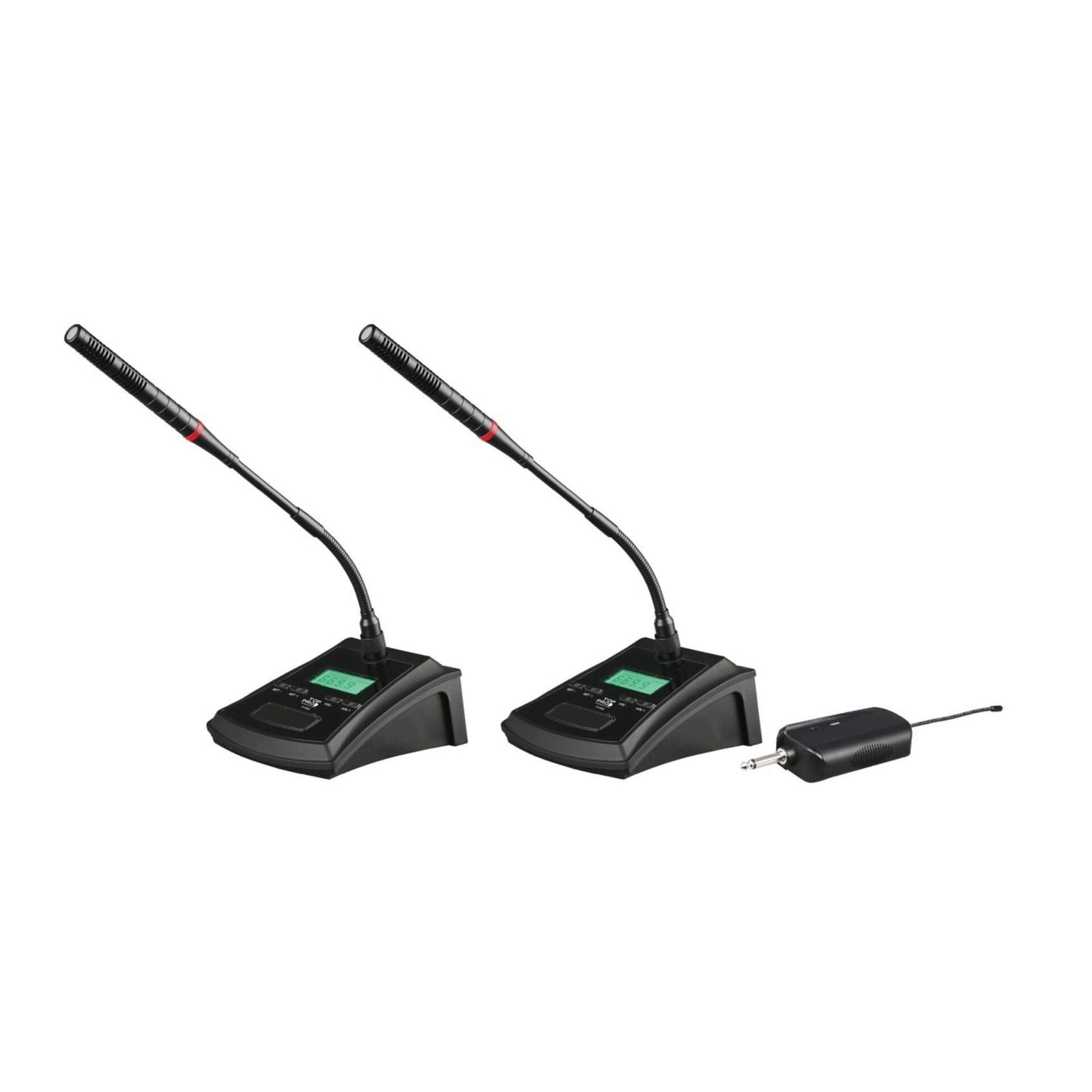 Featuring advanced wireless technology, the X-H02 allows for an easy and flexible setup, with a range of up to 50 meters, ensuring maximum mobility for presenters and participants. The system includes a wireless receiver and a set of wireless microphones, each with its volume control, mute button, and LED indicator.