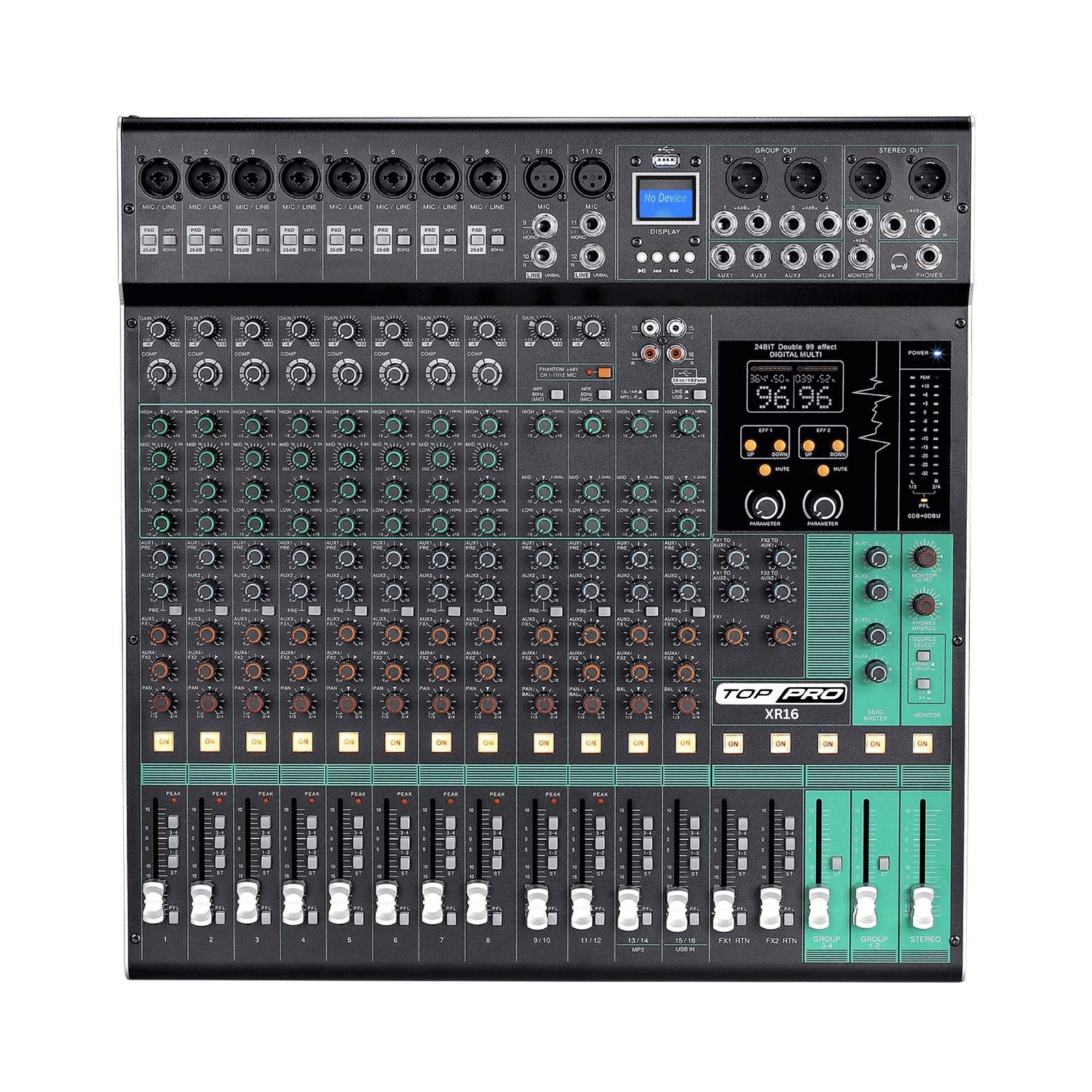 This TOP PRO XR16 Professional Audio Mixer 16 Channel is designed for musicians, DJs, live events, studios, and professional sound applications. With 16 microphone inputs, 8 stereo inputs, dual DSP effects, and modern digital functions, it delivers unmatched versatility and sound quality. Whether for live performance, recording, or broadcasting, this mixer ensures reliable performance and ease of use.
